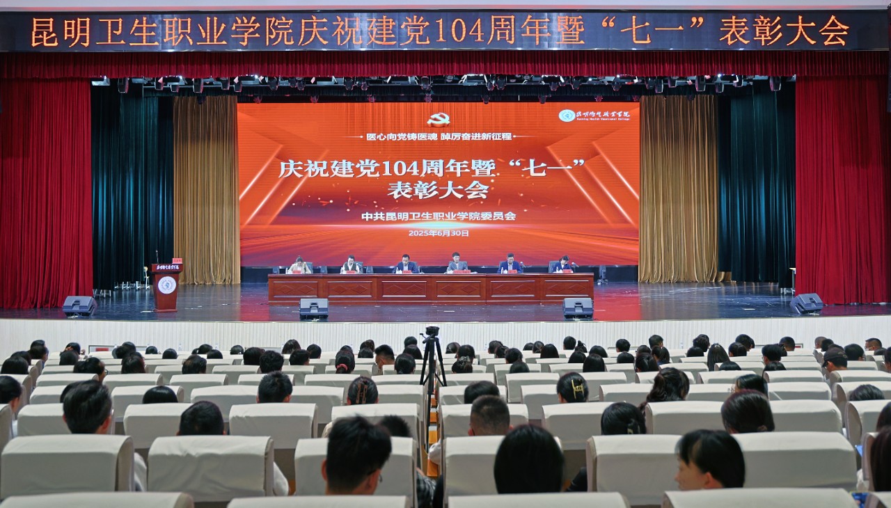 2025年6月30日下午,昆明卫生职业学院庆祝中国共产党成立104周年暨“七一”表彰大会在明德会堂举行。学院党委书记(督导专员)马季昕,党委副书记、院长龙雨霏,党委委员陶晓燕、王斌、张路、张艳出席会议,副院长张尤松、李玉晶,各部处室及二级学院负责人,各党(总)支部书记、副书记、委员、组织员,全体党员、预备党员、入党积极分子和发展对象参加会议。表彰大会由党委副书记、院长龙雨霏主持。大会在庄严的国歌声...