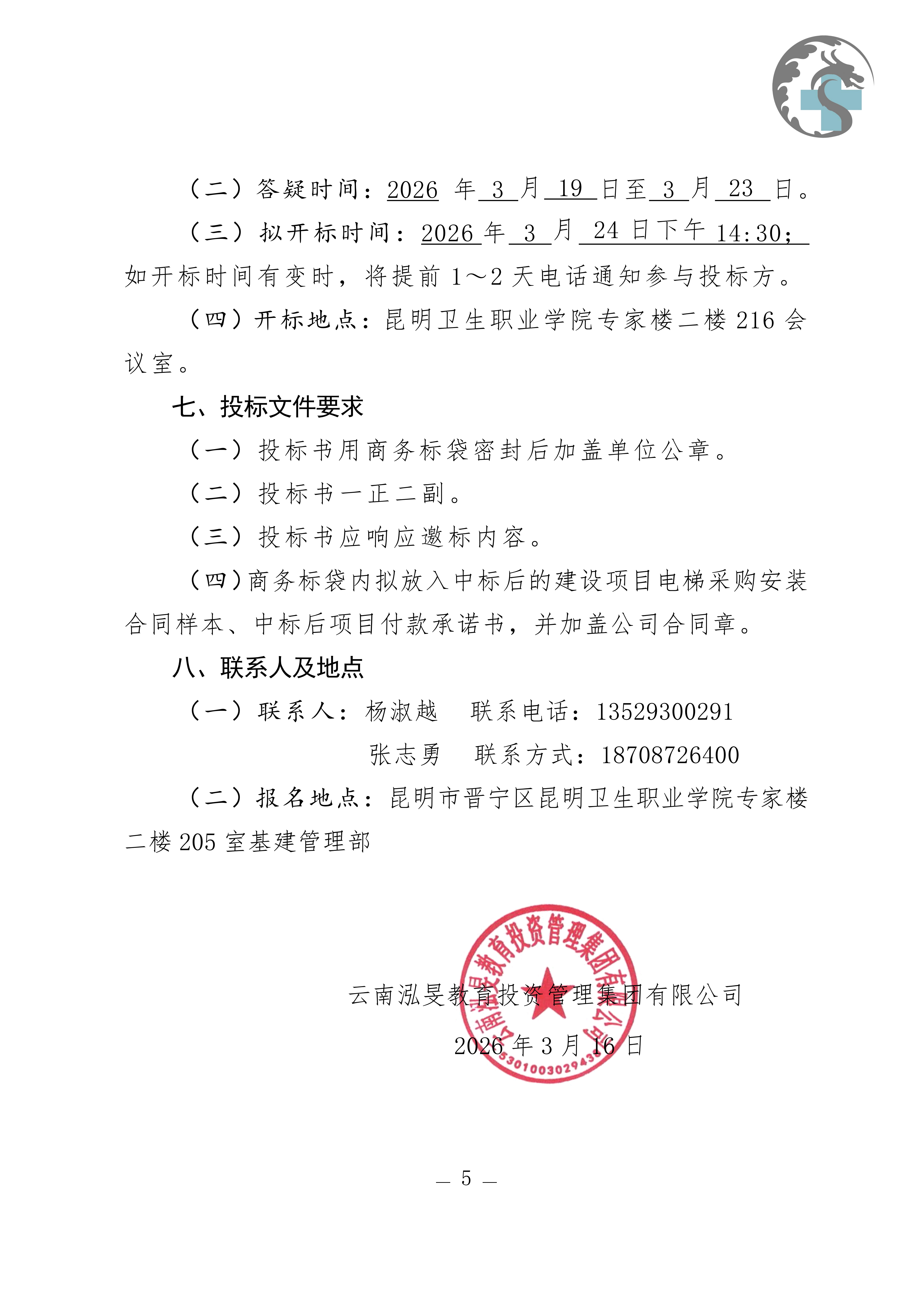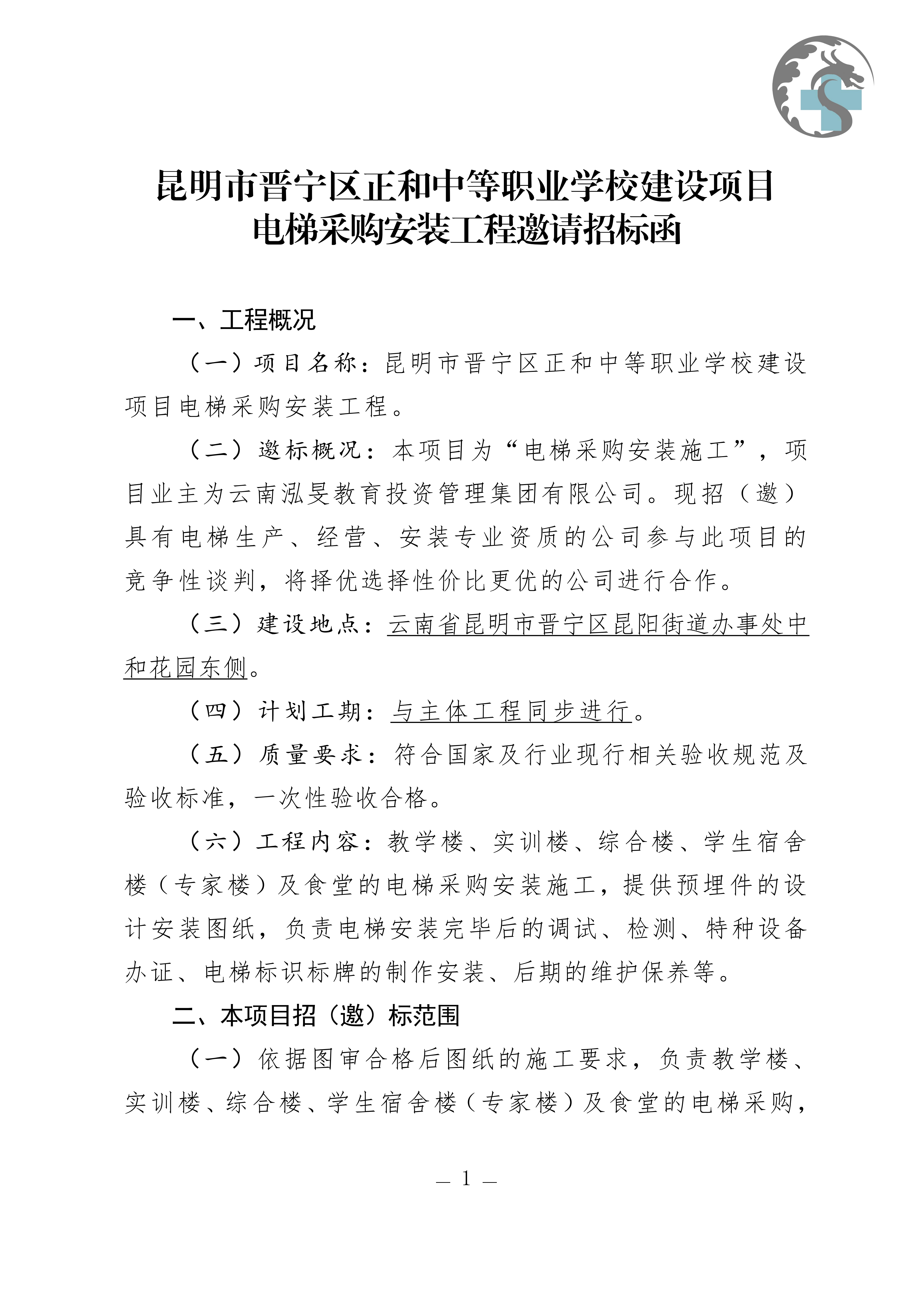 昆明市晋宁区正和中等职业学校建设项目电梯采购安装工程邀请招标函
